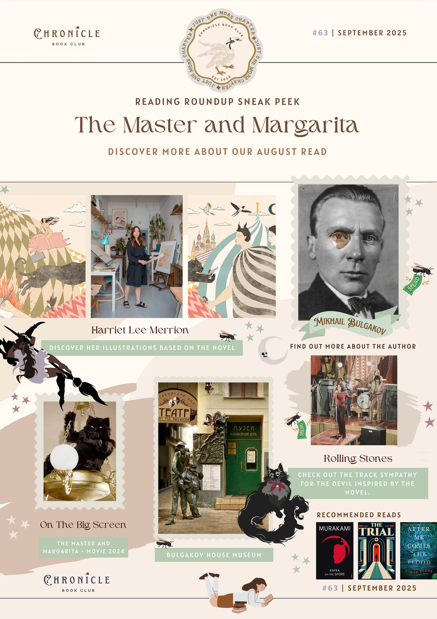 Reading RoundupsAugust Reading Roundup Sneak Peek The Master & Margarita Discover more about what's in our August Reading Roundup Newsletter featuring The Master and Margarita by Mikhail Bulgakov Chronicle Book ClubSep 01, 2025ShareThanks for reading! Subscribe for free to receive new posts and support our club.SubscribePreviousNext