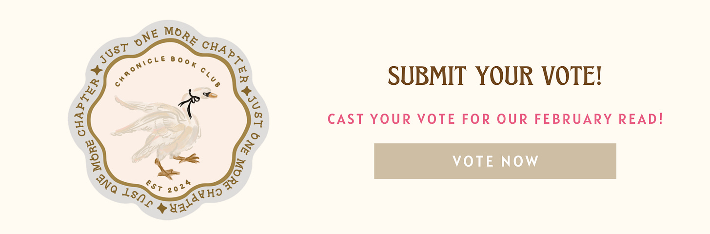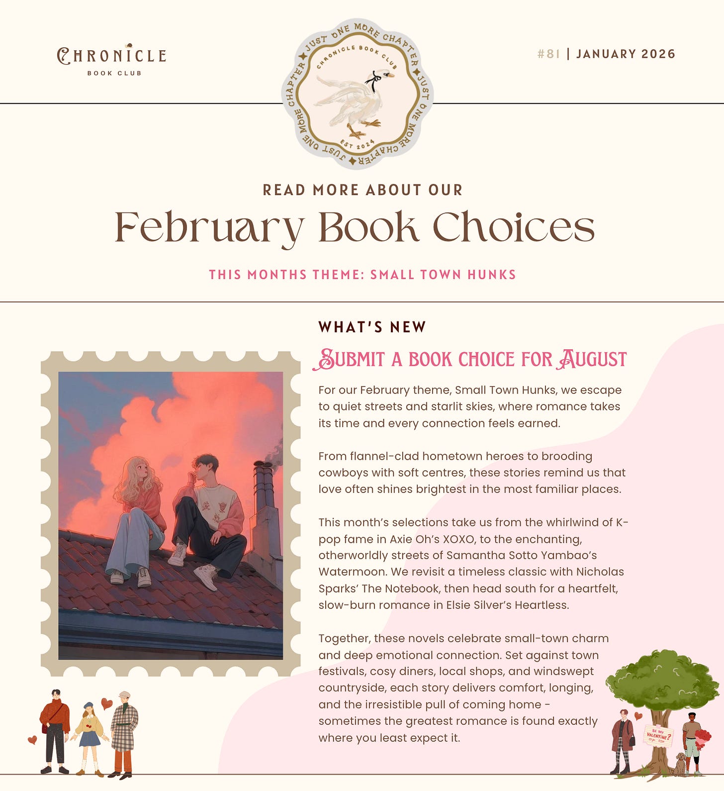 Book Submissions & Vote February Book Choice & VoteFebruary Read-A-Long: Small Town HunksChronicle Book ClubJan 20, 2026SharePrevious