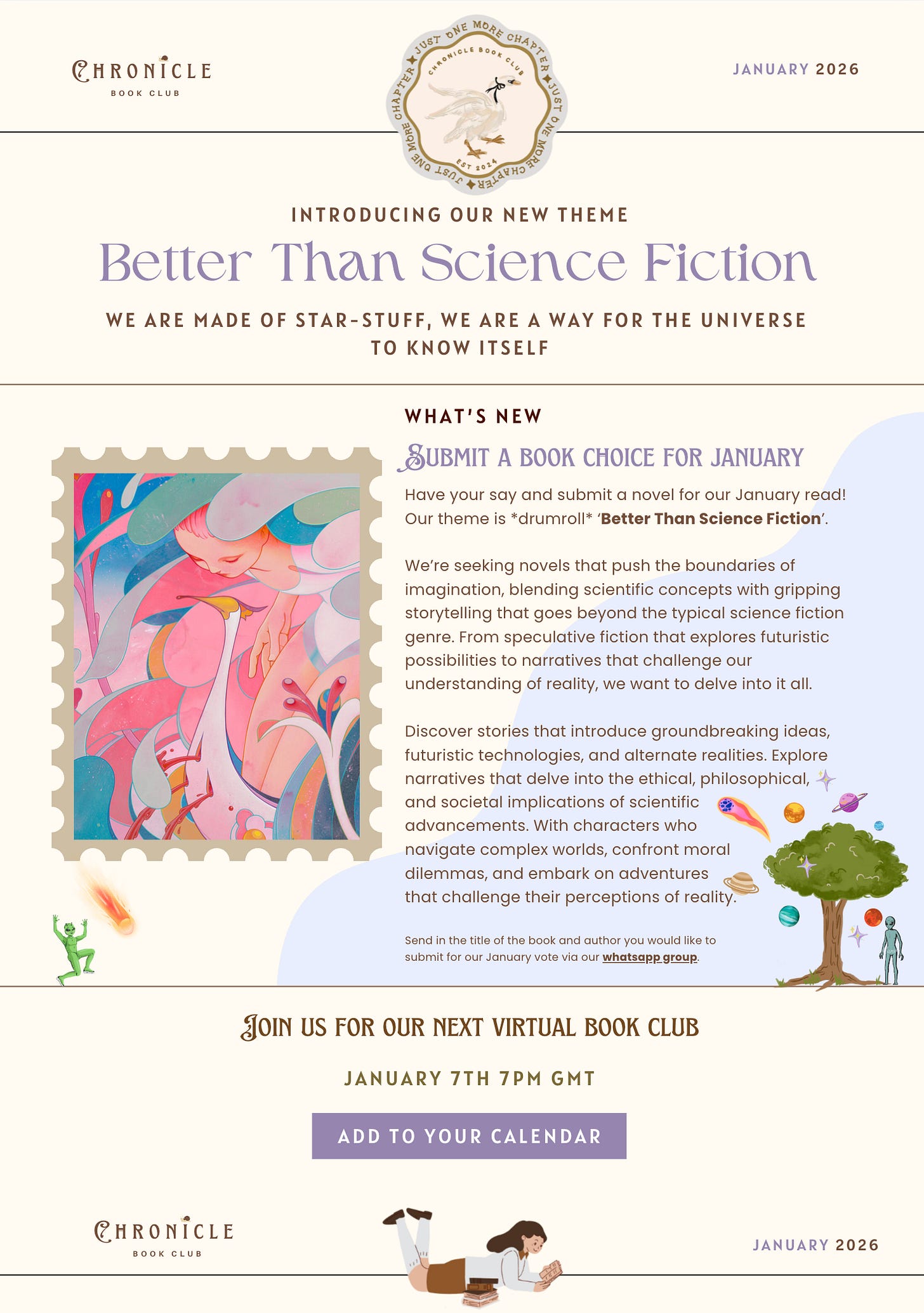 Read-A-Long ThemesJanuary Read-A-Long Theme - Better Than Science FictionDiscover the theme for our January reading submission.Chronicle Book ClubDec 04, 2025ShareThanks for reading Chronicle Book Club! Subscribe for free to receive new posts and support our club.SubscribePrevious
