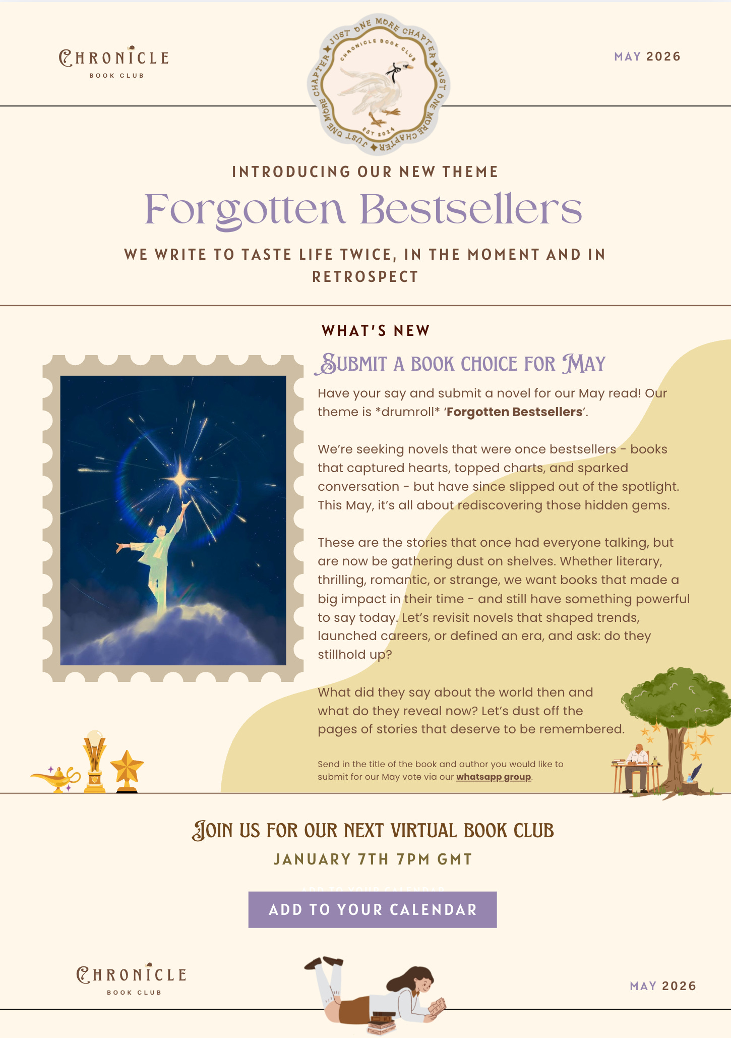Read-A-Long ThemesMay Read-A-Long Theme - Forgotten BestsellersDiscover the theme for our May reading submission.Chronicle Book ClubApr 02, 2026ShareThanks for reading Chronicle Book Club! Subscribe for free to receive new posts and support our club.SubscribePrevious